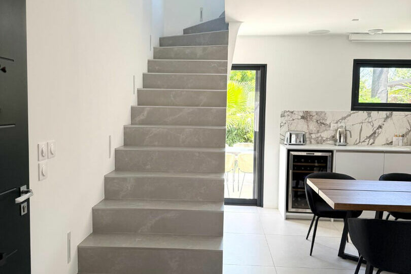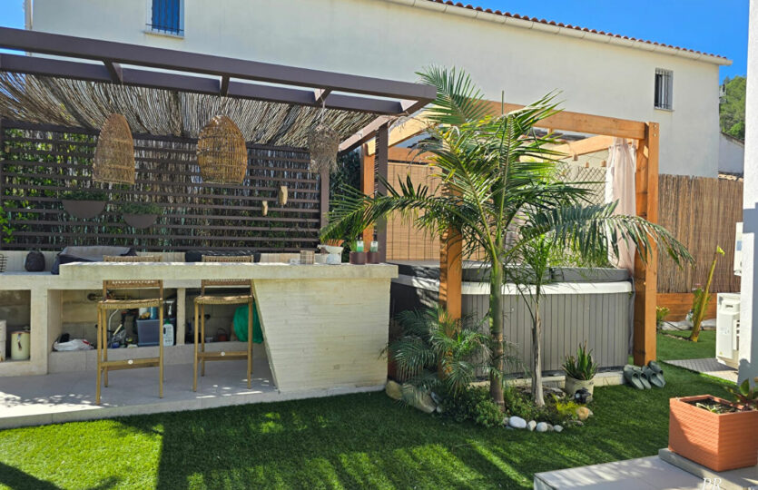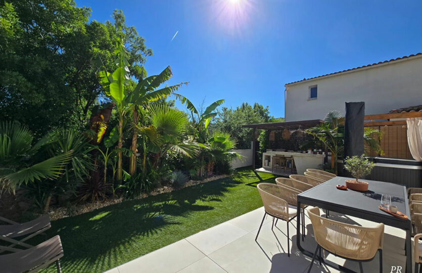 Dans un environnement paisible, Villa contemporaine de 2022, édifiée sur un terrain de 416m², en impasse. Villa alliant lignes épurées et prestations haut de gamme. En RDC, Grande pièce de vie lumineuse ouvrant sur terrasse. A l’étage : deux chambres (dont une avec dressing) et une élégante salle d’eau. Bel espace extérieur, d’une surface utile de 280m² environ, composé d’une grande terrasse, d’un salon de jardin avec banquette, d’un espace convivial avec jacuzzi, cuisine d’été et bar sous pergola. Deux places de parking closes avec porte électrique + pergola végétalisée. A proximité immédiate des commodités, cette villa allie parfaitement calme, confort et praticité au quotidien. A visiter sans tarder !Un bien d’exception, prêt à vivre. Patricia BATTINI (EI) Agent Commercial – Numéro RSAC : – .