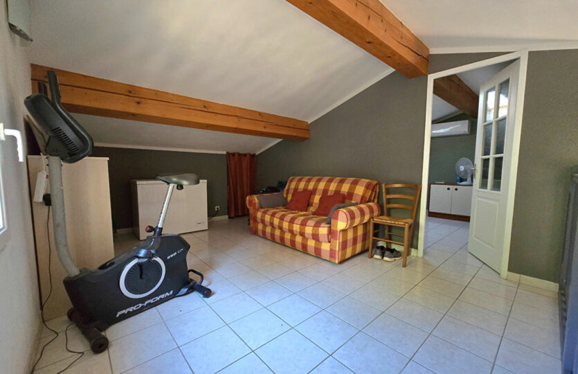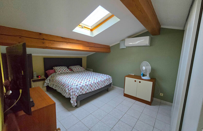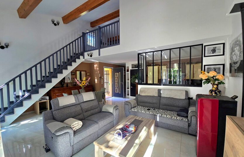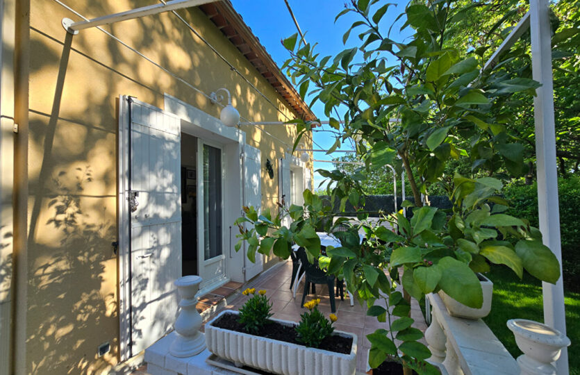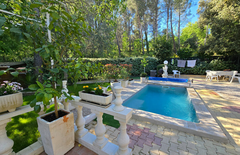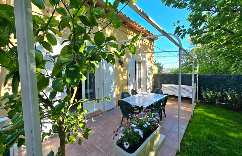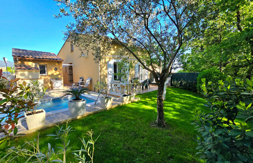 Dans un environnement campagne, au calme absolu et en fond d’impasse au sein d’un petit îlot sécurisé avec portail automatique, découvrez cette agréable villa offrant une vue dégagée. Implantée sur un terrain clos et paysagé de 418 m², la propriété dispose d’une piscine (4,5 x 2,4 m), d’un cabanon en bois ainsi que d’un garage indépendant d’environ 15 m². La villa, élevée d’un étage (R+1), développe une surface de 104 m² au sol (80,56m² en loi Carrez qui ne prend pas en compte les pièces mansardées dans leurs totalité). Elle se compose d’un bel espace de vie lumineux avec de beaux volumes, ouvert sur une terrasse carrelée agrémentée d’une pergola en fer forgé. La cuisine est entièrement équipée. A l’étage, vous trouverez une chambre mansardée ainsi qu’un espace bureau en mezzanine ouvert sur le séjour, offrant un cadre de vie à la fois chaleureux et fonctionnel. Prestations soignées : climatisation réversible, matériaux de qualité, extérieur aménagé avec goût. Un bien rare, à découvrir sans tarder. Patricia BATTINI (EI) Agent Commercial – Numéro RSAC : – .