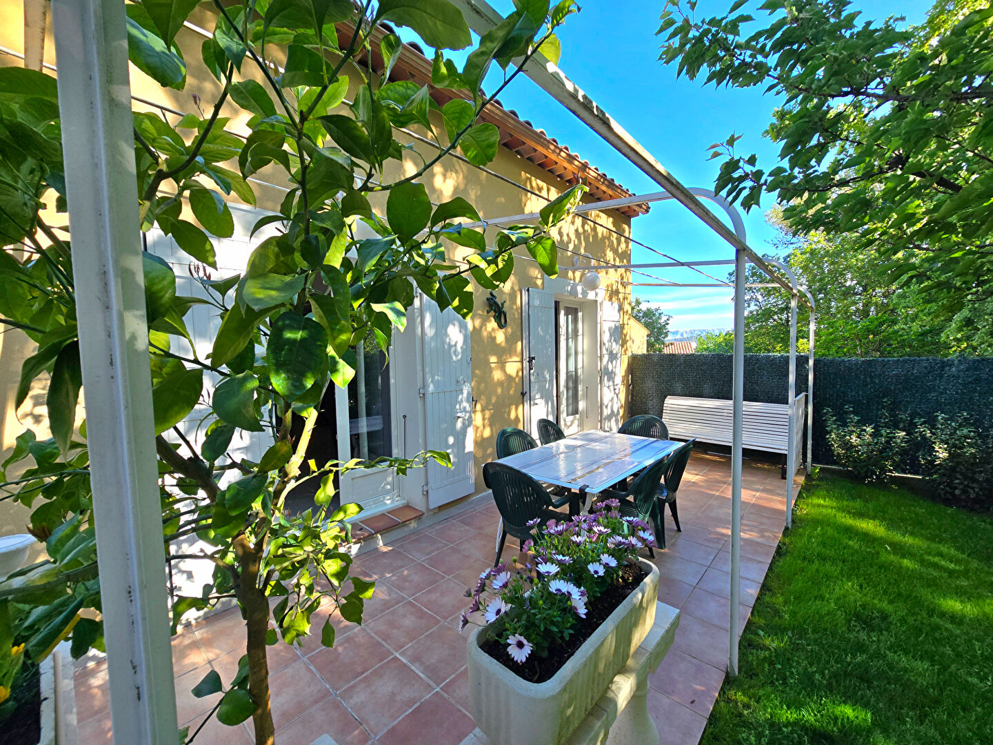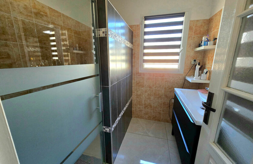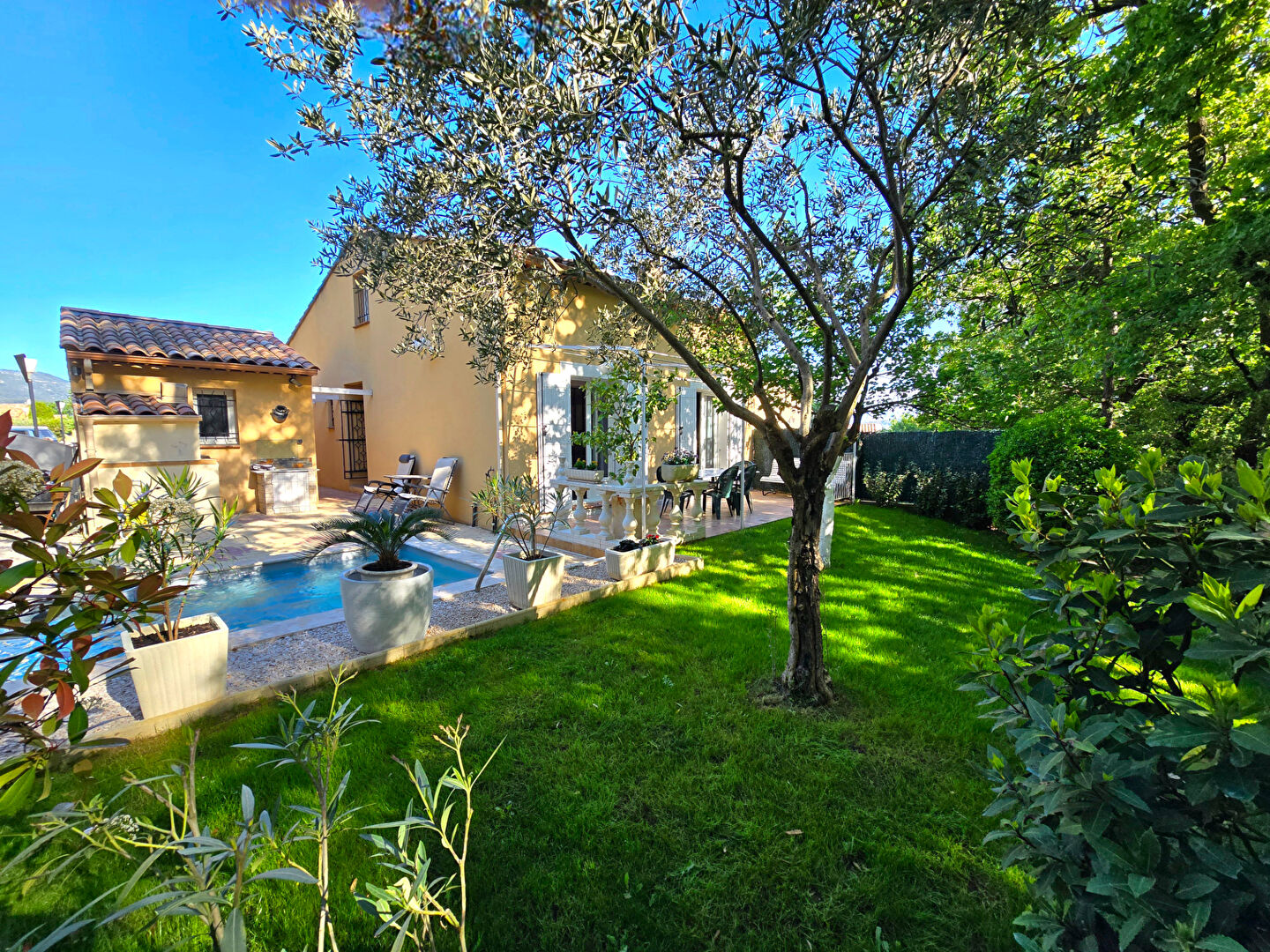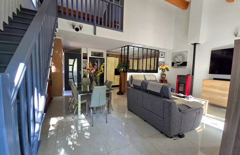 Dans un environnement campagne, au calme absolu et en fond d’impasse au sein d’un petit îlot sécurisé avec portail automatique, découvrez cette agréable villa offrant une vue dégagée. Implantée sur un terrain clos et paysagé de 418 m², la propriété dispose d’une piscine (4,5 x 2,4 m), d’un cabanon en bois ainsi que d’un garage indépendant d’environ 15 m². La villa, élevée d’un étage (R+1), développe une surface de 104 m² au sol (80,56m² en loi Carrez qui ne prend pas en compte les pièces mansardées dans leurs totalité). Elle se compose d’un bel espace de vie lumineux avec de beaux volumes, ouvert sur une terrasse carrelée agrémentée d’une pergola en fer forgé. La cuisine est entièrement équipée. A l’étage, vous trouverez une chambre mansardée ainsi qu’un espace bureau en mezzanine ouvert sur le séjour, offrant un cadre de vie à la fois chaleureux et fonctionnel. Prestations soignées : climatisation réversible, matériaux de qualité, extérieur aménagé avec goût. Un bien rare, à découvrir sans tarder. Patricia BATTINI (EI) Agent Commercial – Numéro RSAC : – .